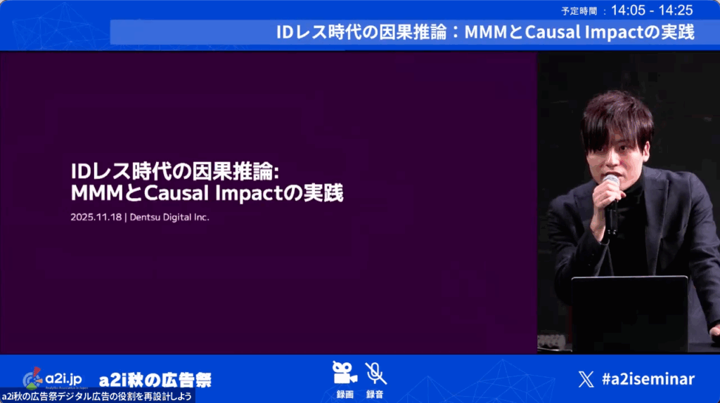 11月18日に開催された大型イベント「a2i秋の広告祭」で、株式会社電通デジタルのソリューション戦略部 データサイエンスグループ マネージャーの吉田 秀穂氏が、「IDレス時代の因果推論:MMMとCausal Impactの実践」について講演を行いました。
