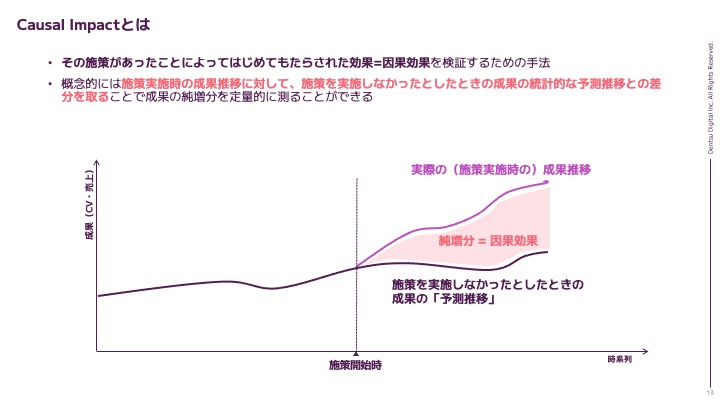 施策を実施しなかった時の推移と、実施した際の推移を統計的に比較分析して、その成果による純増分を定量化することができます。