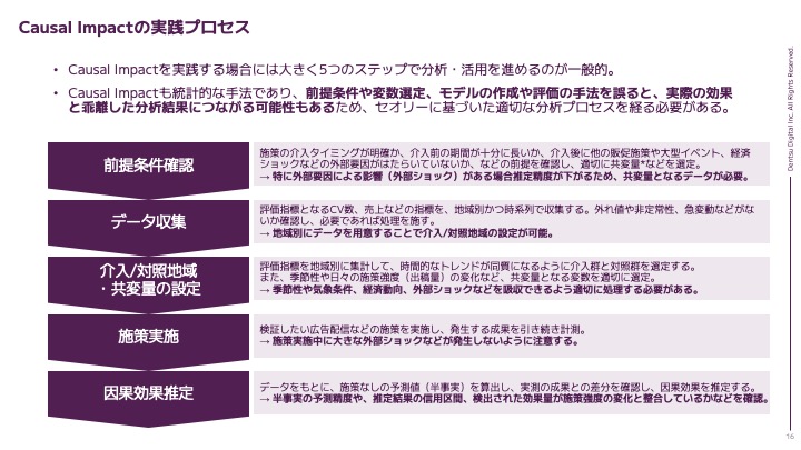 統計的な因果推論では、ただツールを実行するだけではなく、統計的セオリーに基づく適切な分析プロセスをとることが、精度高い成果を上げるために重要です。正しいステップを経ることで、より満足できる納得感が得られます。