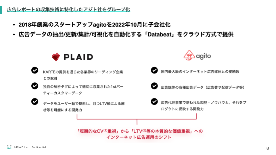 プレイドは、広告支援ツール「Databeat」を提供するアジトを、2022年に子会社化しました。広告領域に強いアジトがグループに入ったことで、ファーストパーティのユーザーデータと、広告データを密接に連携させることができるようになっています。