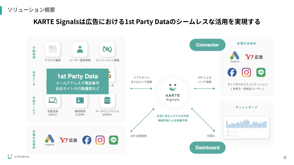 「Connector」は、KARTEなどを通じて収集蓄積されるメールアドレスや電話番号などの自社サイトのファーストパーティの行動データを、広告媒体に連携します。