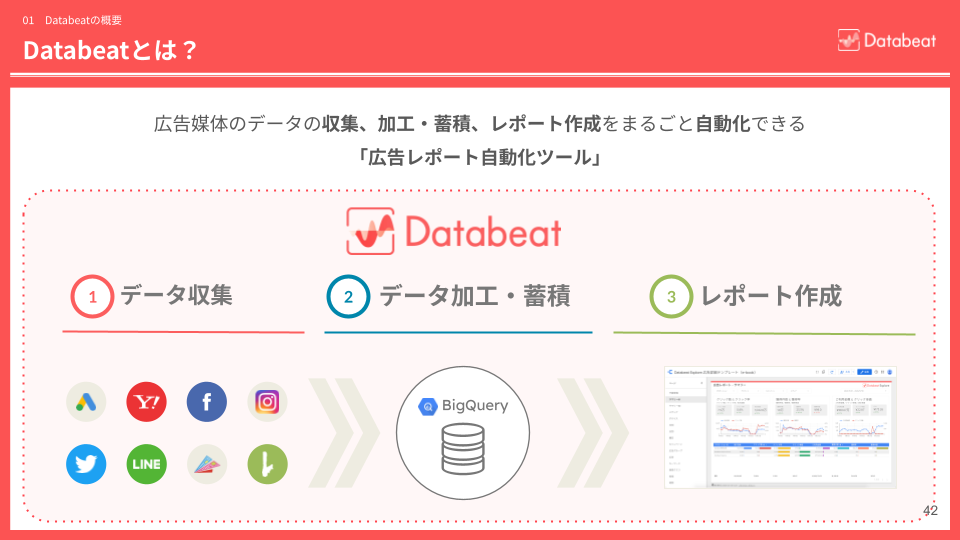 一方、アジトのDatabeatは、広告レポート自動化サービスとして、広告業界では欠かせない存在になっています。カバーする広告媒体数も、国内最大級です。